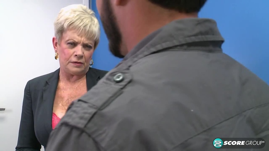 Grey haired grandma in black suit and pink undies got nude before blowing and fucking younger dick on the white couch